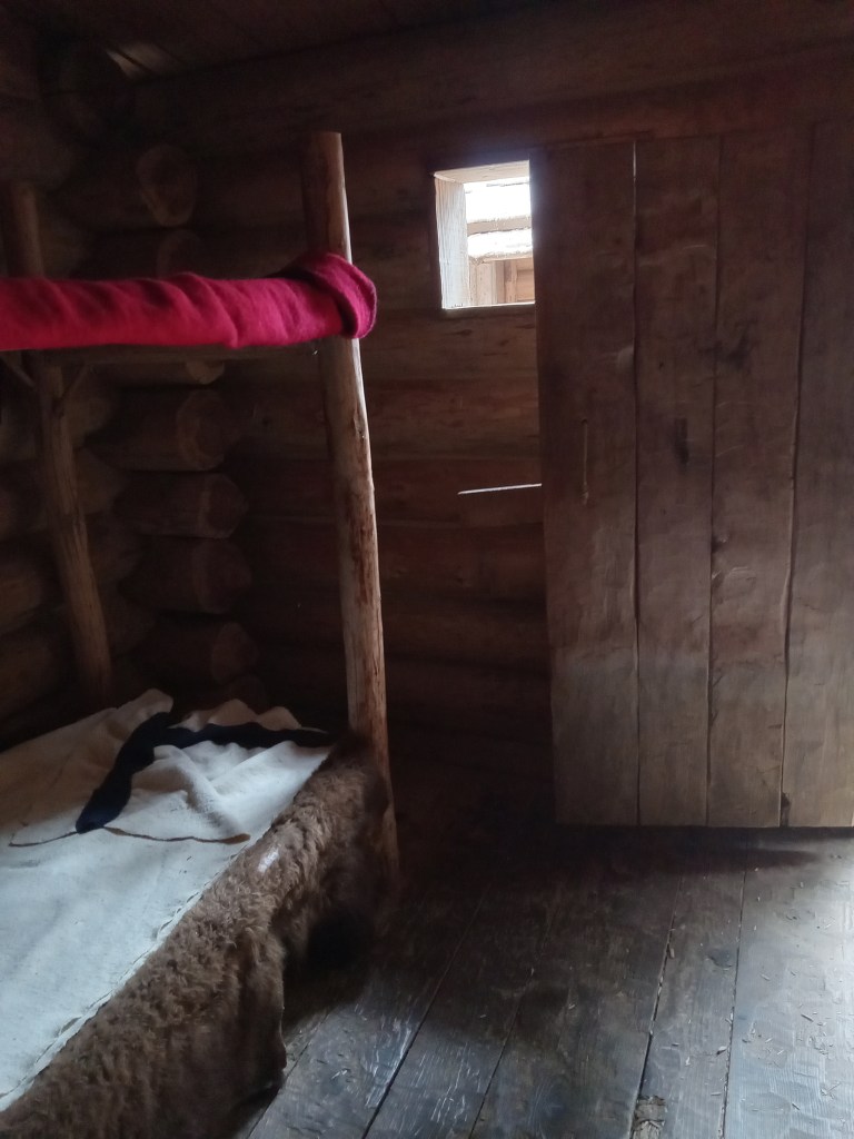 On top of the endless rain, the fort was built for military purposes, not comfort. Thirty two men, one woman, a baby, and a dog lived in the two buildings. The angled roofs were high on the outer edges, and sloped down to a central courtyard. That means all that rain collected in the narrow yard between the buildings. Inside was dark, smoky, and full of fleas. Outside was wet.