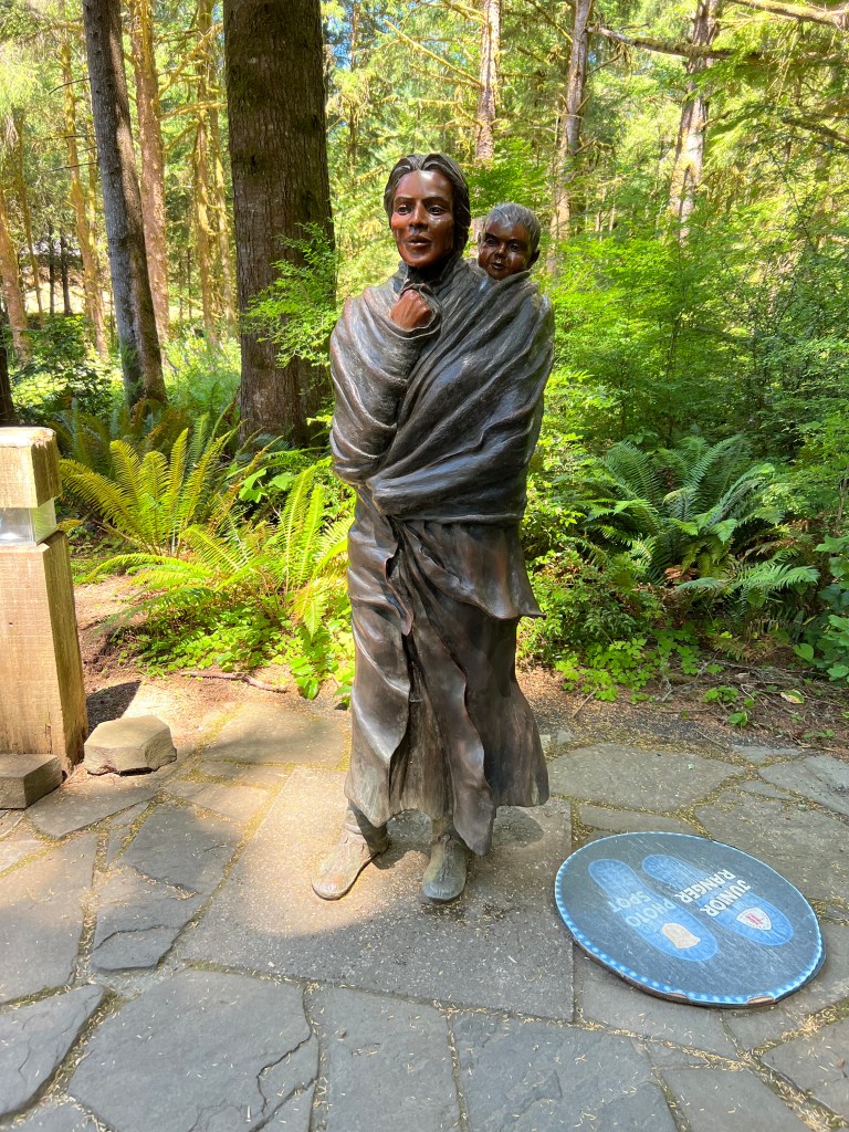 In the winter of 1806, when Pompey was still less than one year old, the Lewis and Clark expedition reached the Pacific Ocean and built Fort Clatsop. They started building on December 8, 1805, and moved in on Christmas Eve, though the roof was not yet finished. Although Sacagawea had a vote in the decision of where to put the fort, I’m sure she never imagined the mud.