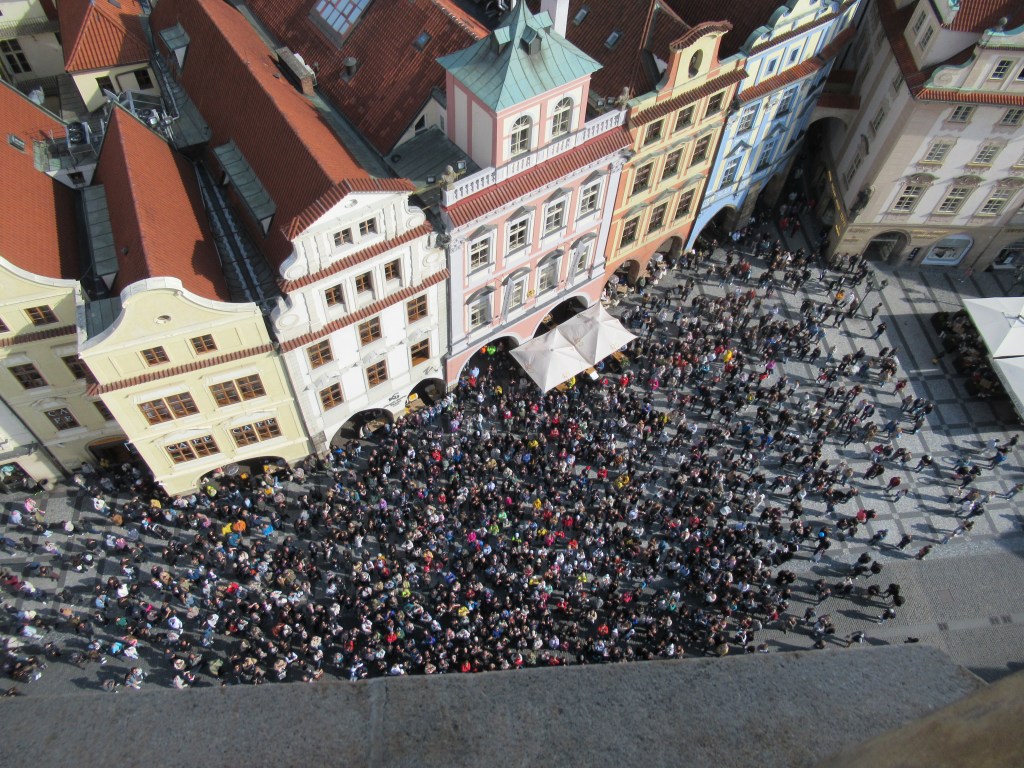 The Old Town Hall is best known for the Astrological Clock, which puts on a show every hour. This tower was built in the 14th century and is about 230 feet tall. The clock, built in the 15th century, is amazing, but the show is rather anticlimatic, lasting only a few minutes. We took a series of elevators to reach the top in time to look down upon the crowd gathered to watch the twelve apostles rotate. The picture on the right is a view of the city from the tower.