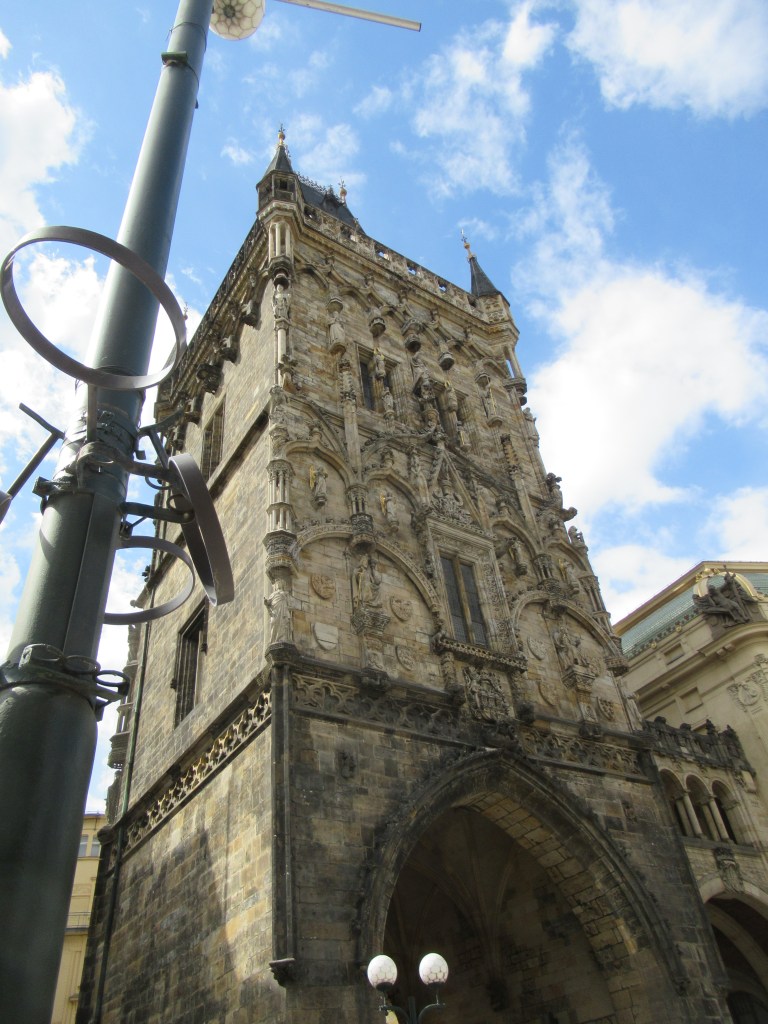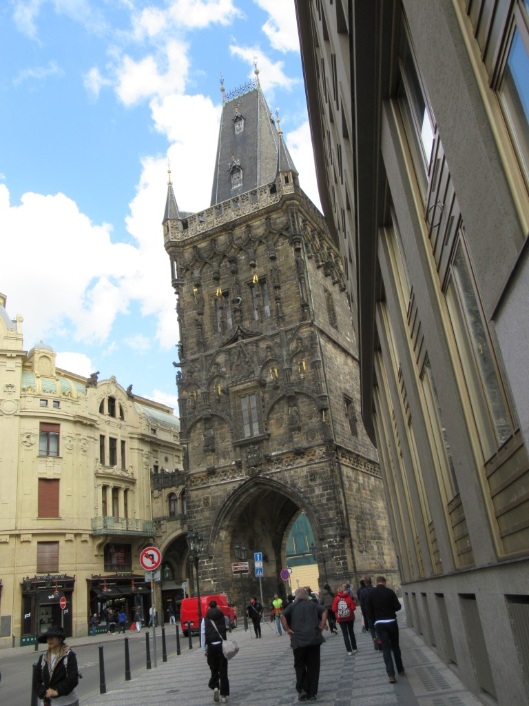 The Powder Tower is one of my favorites. The entrance is a tiny door leading to a spiral stone staircase which you must climb to reach the first floor, where there is a guard/guide to check your ticket. The tower was built in the late 15th century. It stands as the entrance to the Royal Route, leading to Prague Castle. The tower includes wooden stairs as well as the stone steps. Inside there are several unusual statues. The view at the top is magnificent. Pictured here is a view including the Old Town Hall on the left, Our Lady of Tyn Church in the center, and St. Vitus Church at Prague Castle in the distance on the right.