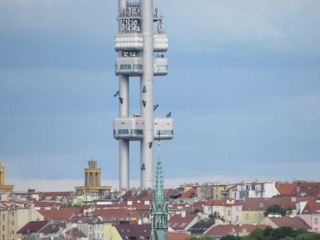 And finally, lest one think all the towers in Prague are centuries old, here is the  Žižkov Television Tower, built between 1985 and 1992. At one time it was voted the ugliest building in Prague. In 2000, ten fiberglass babies by the sculptor, David Černý were added. These babies have a bar code instead of a face. The babies were replaced with identical, more permanent sculptures in 2017.